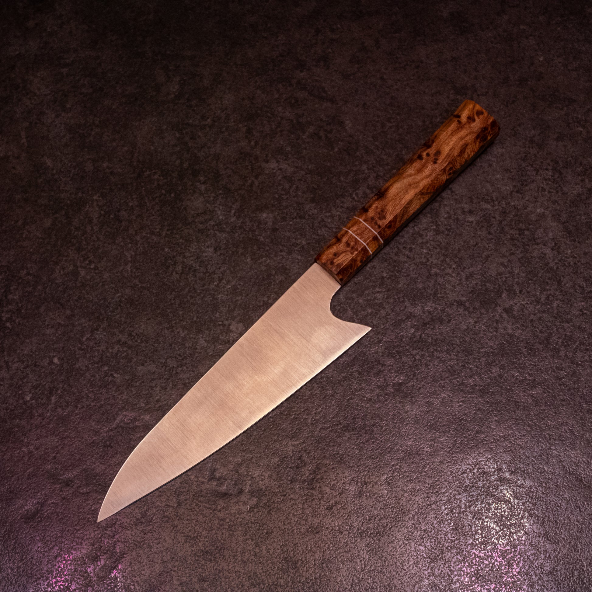 Denne 20 cm Gyuto er håndlavet med fokus på skarphed, balance og holdbarhed. Bladet er lavet i et kulstofstål med rustfri egenskaber – det giver dig den fine skarphed og fornemme æg fra klassisk kulstofstål, men med langt mindre risiko for pletter og korrosion.