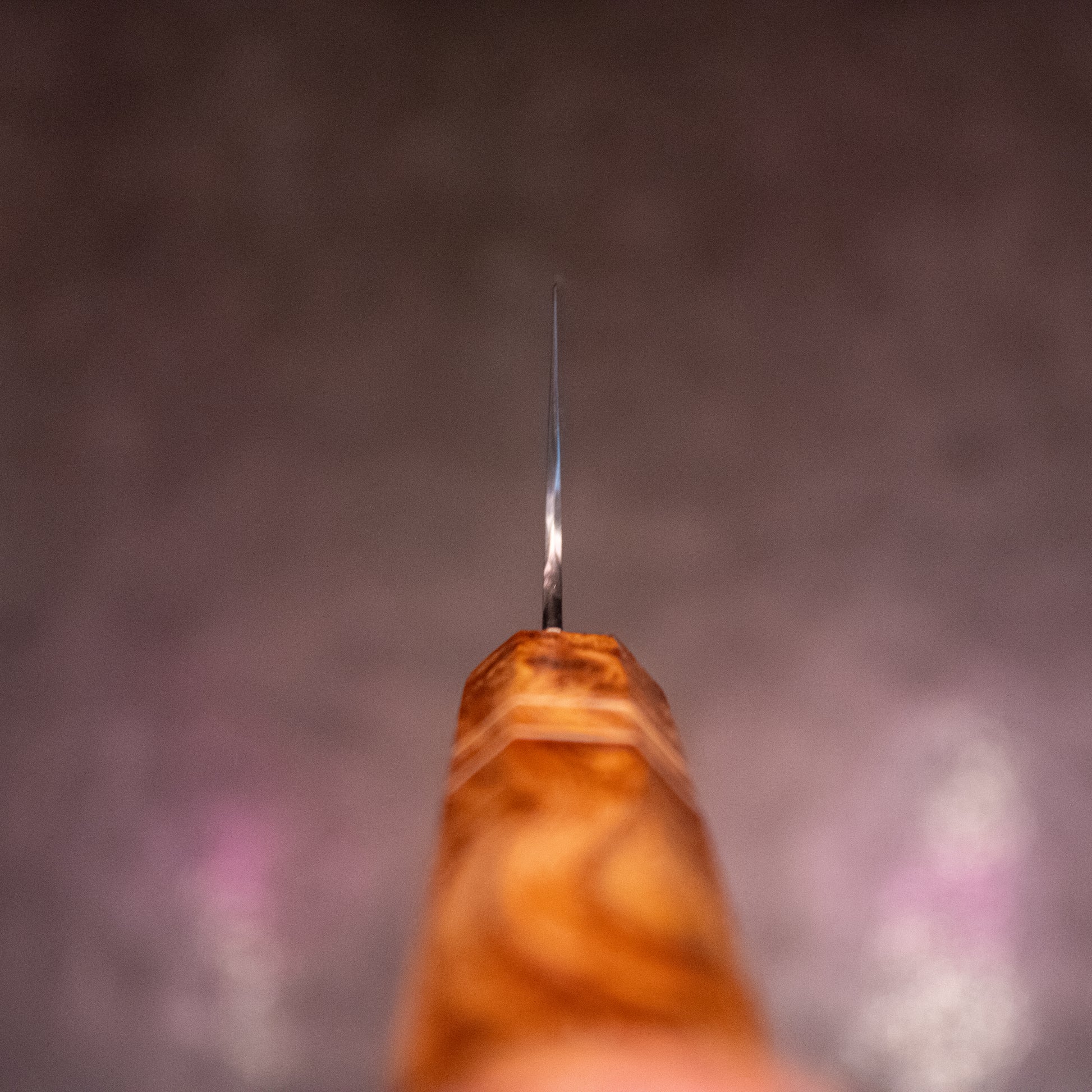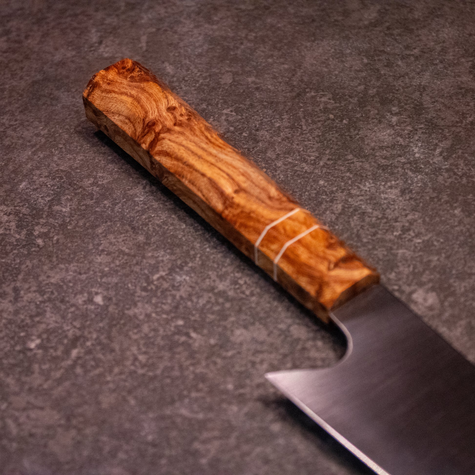 Håndtaget er fremstillet af stabiliseret elmeknude, som både giver et smukt, unikt udtryk og ligger rigtig godt i hånden. Materialet er behandlet, så det er modstandsdygtigt over for fugt og slid, hvilket gør kniven velegnet til daglig brug.
